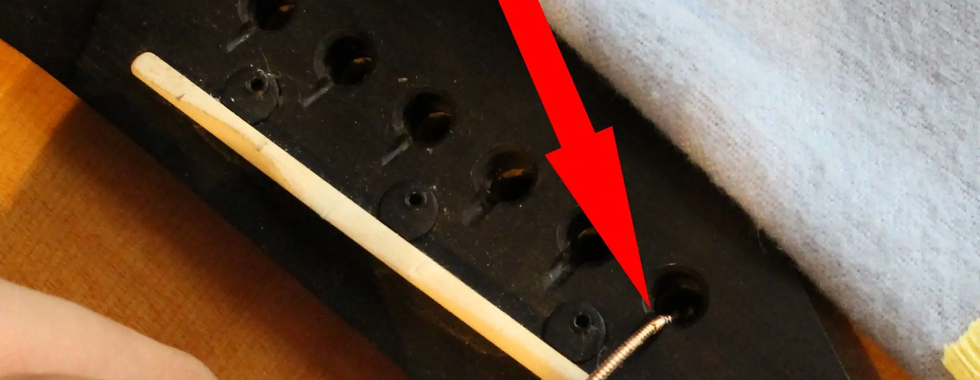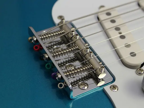 Requiere el corte de las mismas para sacarlas y el uso de una llave Bristol o Allen para introducir las nuevas cuerdas, después llevas tus cuerdas a las clavijas y este puente viene acompañado de un sistema que aprisiona las cuerdas a la altura de la cejuela mediante unos cierres con tornillo (ver imagen 2 y 3), lo cual limita la desafinación aunque se abuse de la palanca. Después de tener tus cuerdas puestas procedes con una primera afinación, esta afinación va a fluctuarte mucho y resultara más complejo y lento el proceso, requiriendo varios intentos y el uso de la llave Bristol y micro afinadores situados en el puente para calibrar el tono adecuado.